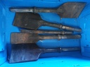 Diverse bouterolles pour appareils pneumatiques: burins en plusieurs largeurs, pointe. Dimensions de la base: 28mm x 15mm. 8 disponibles en un lot. Le tout en très bon état, aiguisé et retremper. Boites vendues séparément.