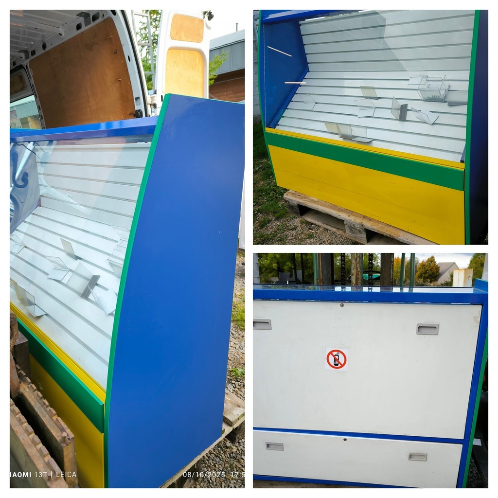 Meuble avec vitrine sur le devant et le dessus comprenant un tiroir arrière bas et un tiroirs support articles à étages. Ferme à clé (sans clé, fabrication possible sur demande 12€ pour les 2 serrures). Autres meubles et comptoirs disponibles sur demande.