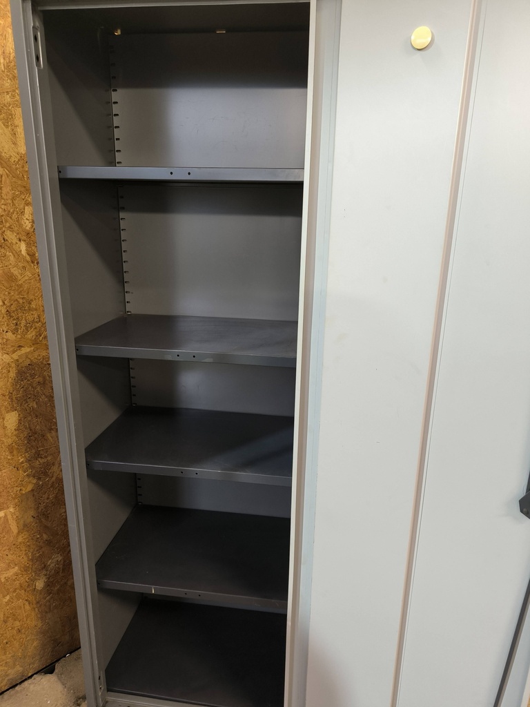 Armoire métallique 1 porte droite gris clair et gris foncé, 4 étagères, sans clé n°C22212, en bon état. 64xp46xh198cm