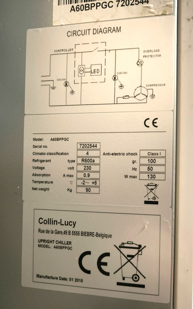 230 V Mono Pieds : hauteur 90 mm Dotation : 4 clayettes réglables en hauteur Livrées avec 2 roulettes montées à l’arrière Évaporateur type roll bond + ventilateur. Porte réversible. Gaz réfrigérant R600. Température 0°C/+10°C. Dégivrage et ré évaporation automatiques. Isolation : 45 mm Sans CFC
